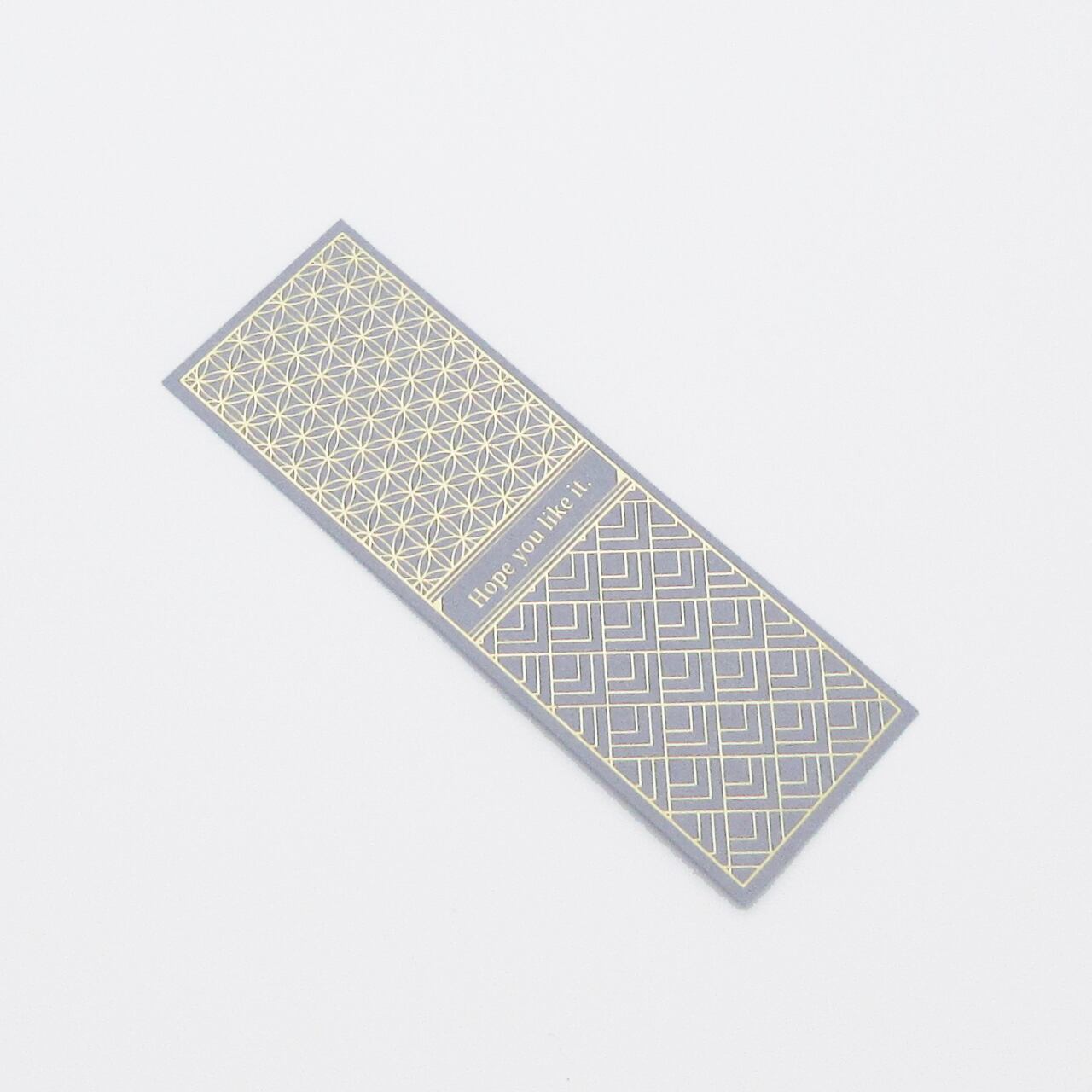 ブルージーンカラーの高級紙に艶消しの金箔で和柄模様を入れています。