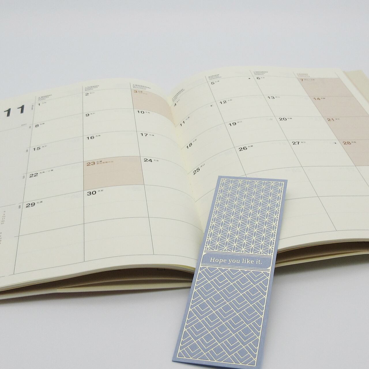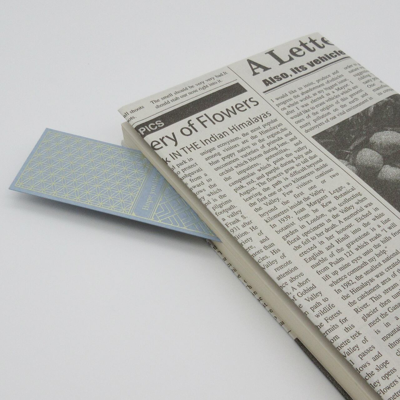 ブルージーンカラーの高級紙に艶消しの金箔で和柄模様を入れています。